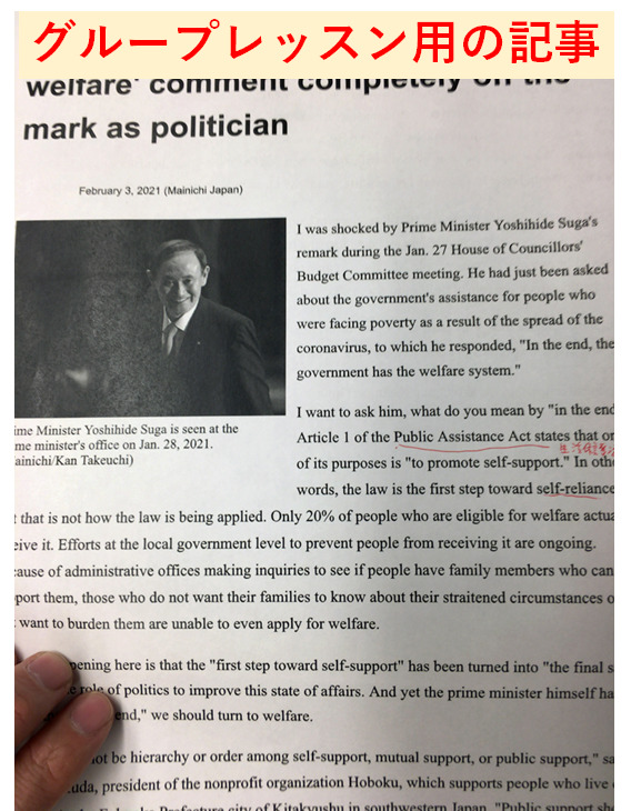 今週は、菅首相の失言に絡んだ、生活保護がトピックでした。今回もあまり馴染みのない話題でしたが、事前に周辺記事を日本語で調べたおかげで、何とか議論についていくことができました。
