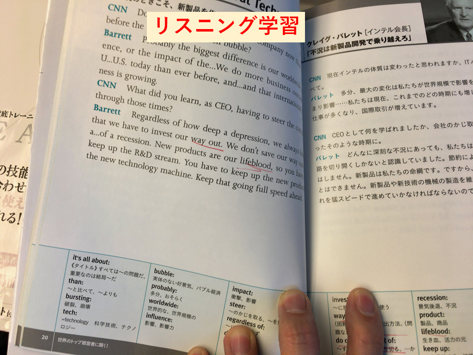 引き続き『世界のトップ経営者に聞く!』のシャドーイングに取り組みました。今週は、エリック・シュミット(Google 前CEO)、トム・グローサー(ロイターCEO)、クレイグ・バレット(インテル会長)、カルロス・ゴーン(元日産・ルノーCEO)のインタビューに取り組みました。