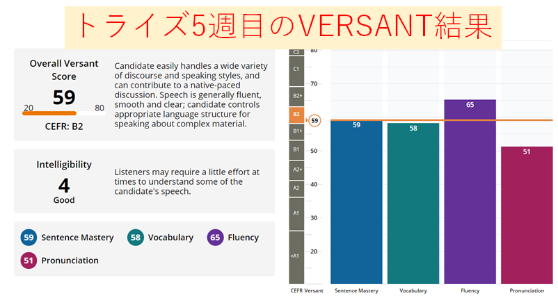 5週目のVERSANTの結果は59点、4週目のVERSANTは58点でしたので1点上がりました。