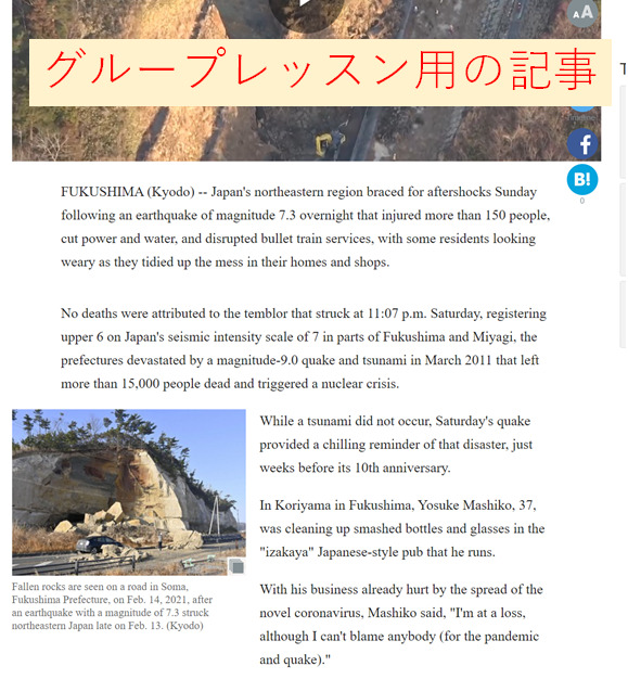 2021年2月13日に福島沖で起きた地震がトピックでした。この地震を“wake-up call(警鐘)”と捉えたとき、災害に対してどのような準備をするべきか? などについて議論をしました。