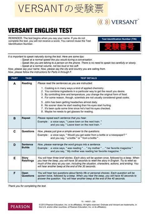 VERSANTのHPで、受験番号を入力するとテストを開始できます。VERSANTは20点~80点で結果が出ます。