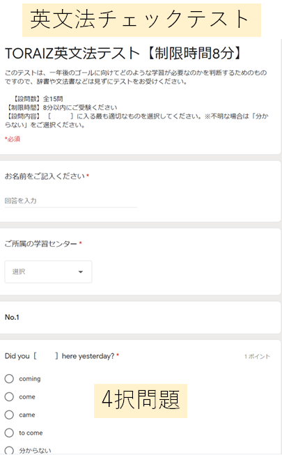 英語レベル確認のため、トライズオリジナルの文法チェックテストを受けます。4択のクイズで、全部で15問です。制限時間は8分です。
