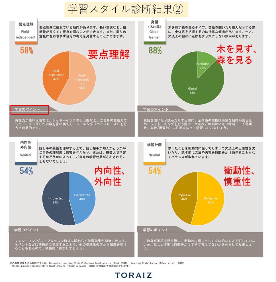 学習スタイル診断で、あなたが無意識に選んでいる学習傾向や、クセなどがわかります。それぞれの傾向に応じた学習のポイントも書かれています。