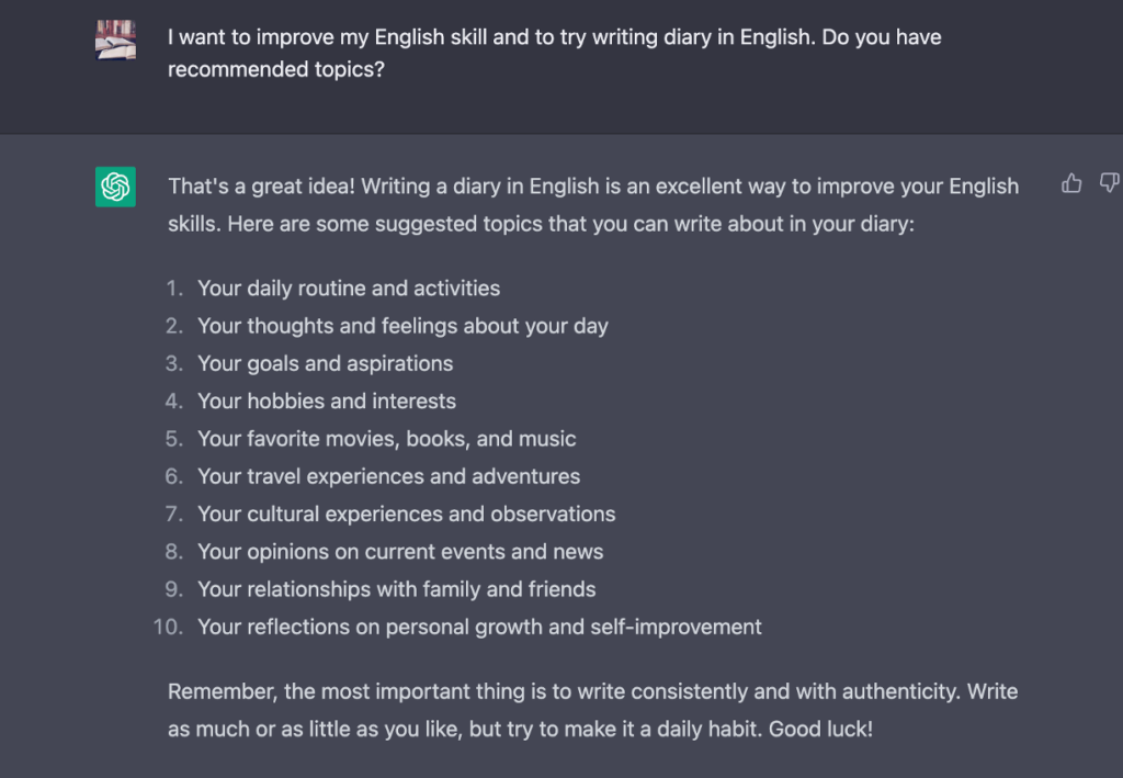 - 24時間いつでも利用可能:ChatGPTはオンラインで利用できるため、24時間いつでも英語学習に取り組むことができます。