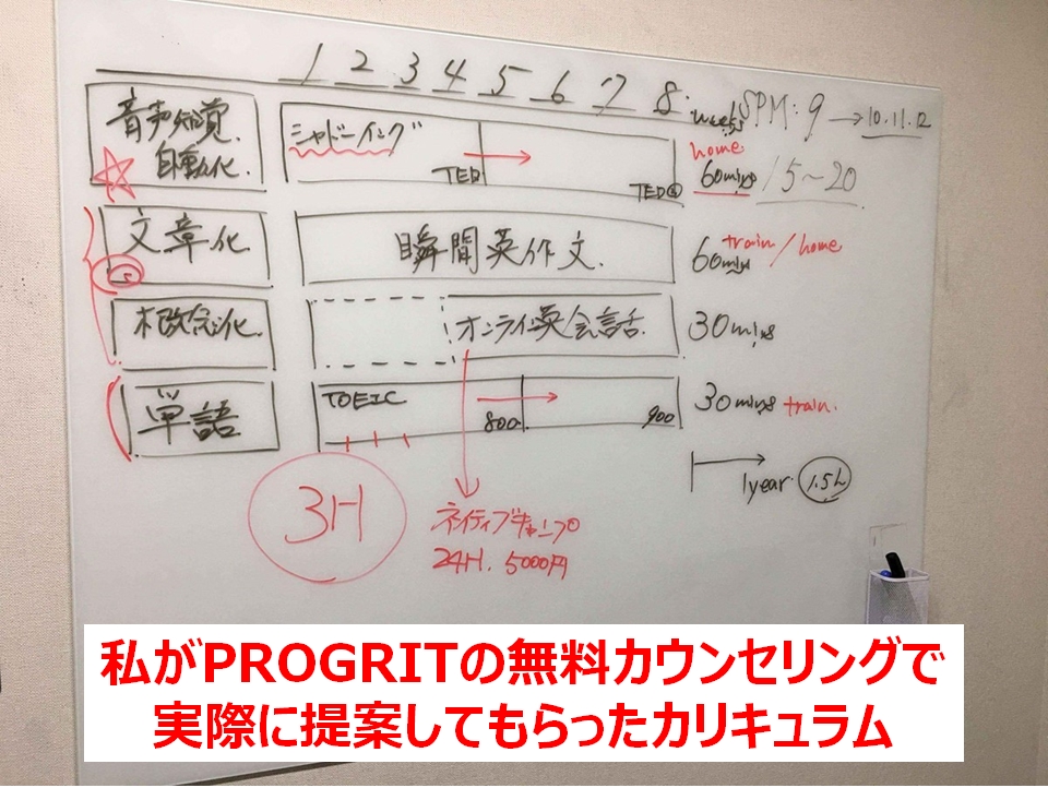 市販の教材を使いますが、どれも厳選されており、無駄がありません。評判のいいものばかりで、たしかに指示通りに進められれば英語力は上がると思います。ただ、英語力は当然ながら一朝一夕には上がりません。どんなに良いメソッドでも年単位で語学の習得には時間がかかります。プログリットはよいメソッドですが、いかんせん料金が高く、長く続けることが難しいです。