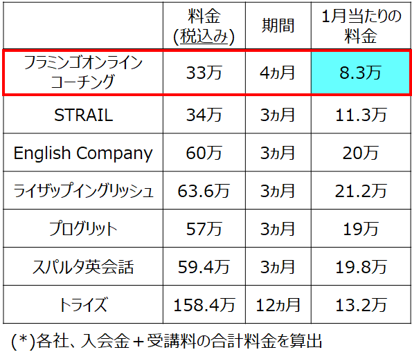 フラミンゴオンラインコーチングは、他社の英語コーチングスクールと比べてもコスパが高いです。